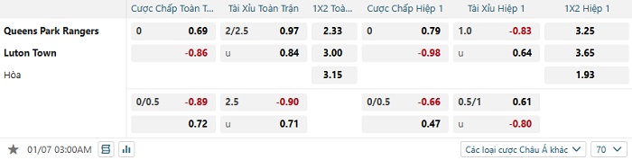 Bảng tỷ lệ kèo bóng đá QPR vs Luton