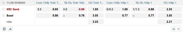 - Kèo tỷ số H2 Racing Genk vs Basel: 1-0
