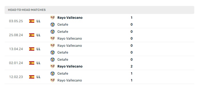 Lịch sử đối đầu Rayo Vallecano vs Getafe