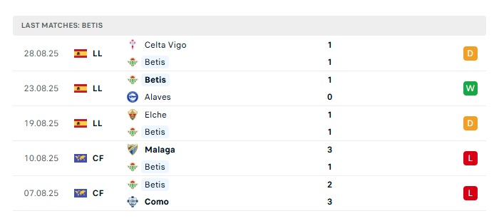 • Phong độ gần đây Real Betis