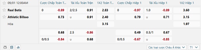 Bảng tỷ lệ kèo bóng đá Real Betis vs Athletic Bilbao