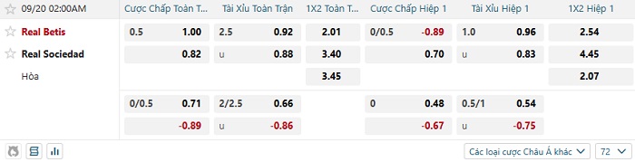 Bảng tỷ lệ kèo bóng đá Real Betis vs Real Sociedad