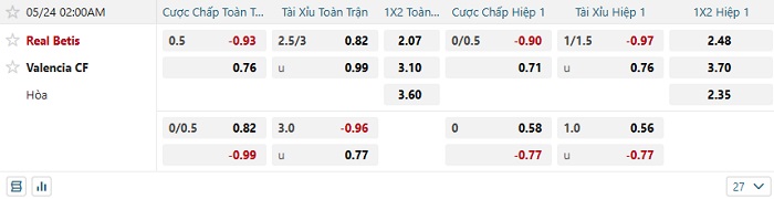 Soi kèo châu Á, kèo Real Betis vs Valencia