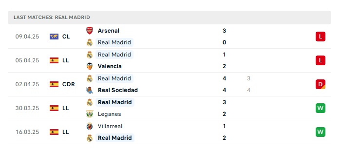 Phong độ gần đây Real Madrid vs Arsenal