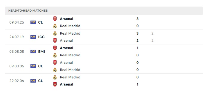 - Kèo tỷ số H2 Real Madrid vs Arsenal: 3-1