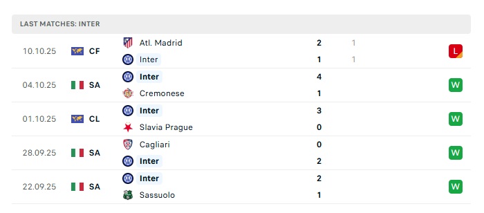 - Phong độ gần đây Inter Milan