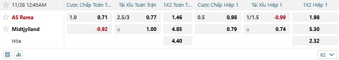 Soi kèo châu Á, kèo Roma vs Midtjylland