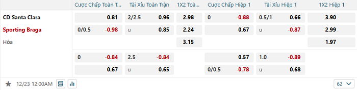 Bảng tỷ lệ kèo bóng đá Santa Clara vs Braga