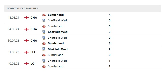 Lịch sử đối đầu Sheffield Wed vs Sunderland