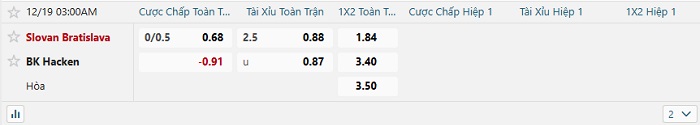 Bảng tỷ lệ kèo bóng đá hôm nay Slovan vs Hacken