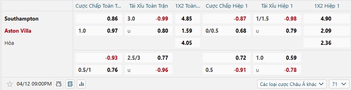Bảng kèo bóng đá Southampton vs Aston Villa
