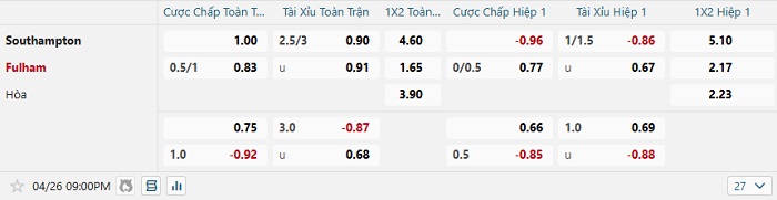 Bảng tỷ lệ kèo nhà cái Southampton vs Fulham