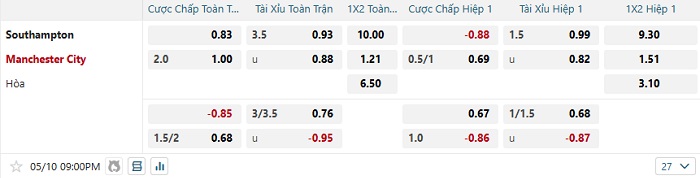 Bảng tỷ lệ kèo bóng đá hôm nay Southampton vs Man City