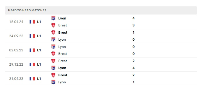 Lịch sử đối đầu Stade Brestois vs Lyon