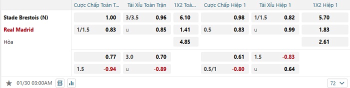 Bảng tỷ lệ kèo bóng đá Stade Brestois vs Real Madrid