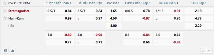 Trong khi đó thì với Stromsgodset, họ đang phải nhận mức chấp -3/4 từ nhà cái và rất khó thắng kèo. Tính trong 6 trận đấu gần nhất của đội chủ nhà, họ chỉ có 1 chiến thắng và còn lại là 5 trận toàn thua. Trong khi đó thì Ham Kam ở 5 trận đấu gần nhất, họ đã thắng kèo 4, thua 1. Do đó, các chuyên gia đều tin rằng trận đấu hôm nay sẽ có đội khách là lựa chọn đầu tư an toàn nhất trong cả 2 hiệp.