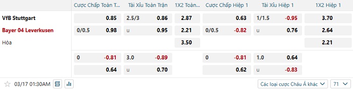 Bảng tỷ lệ kèo bóng đá Stuttgart vs Bayer Leverkusen