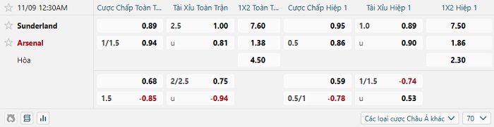 Bảng tỷ lệ kèo nhà cái Sunderland vs Arsenal