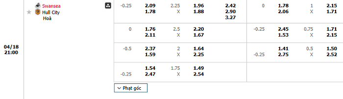 Bảng tỷ lệ kèo nhà cái Swansea City vs Hull City