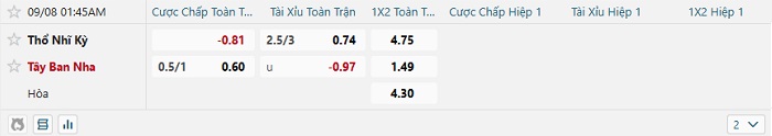 Bảng tỷ lệ kèo bóng đá Thỗ Nhĩ Kỳ vs Tây Ban Nha