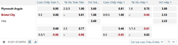 Tip kèo Châu Á hiệp 1 Plymouth vs Bristol City