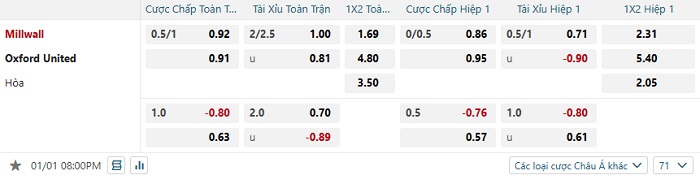 Tip kèo Châu Á hiệp 1 Millwall vs Oxford