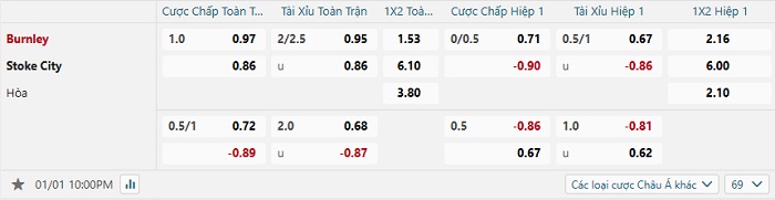 Tip kèo Châu Á hiệp 1 Burnley vs Stoke