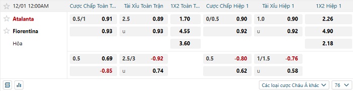 Tip kèo Châu Á full trận Atalanta vs Fiorentina