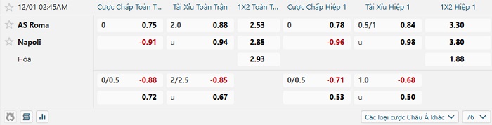 Tip kèo Châu Á hiệp 1 Roma vs Napoli