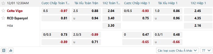 Tip kèo Châu Á full trận Celta Vigo vs Espanyol