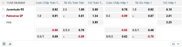 Tip kèo Châu Á hiệp 1 Juventude vs Palmeiras