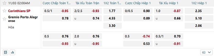 Tip kèo Châu Á full trận Corinthians vs Gremio