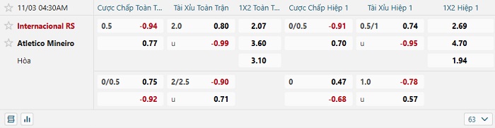 Tip kèo Châu Á hiệp 1 Internacional vs Atletico Mineiro