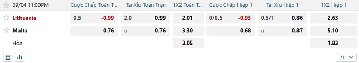 Tip kèo Châu Á hiệp 1 Lithuania vs Malta