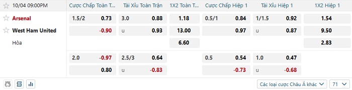 Tip kèo Châu Á hiệp 1 Arsenal vs West Ham