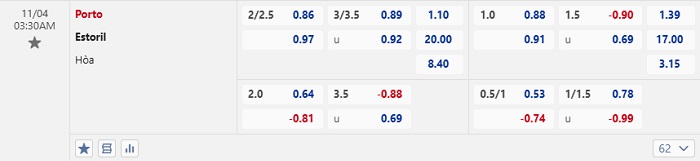 Tip kèo Châu Á hiệp 1 Porto vs Estoril