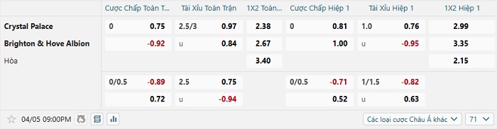 Tip kèo Châu Á full trận Crystal Palace vs Brighton