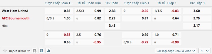 Tip kèo Châu Á hiệp 1 West Ham vs Bournemouth