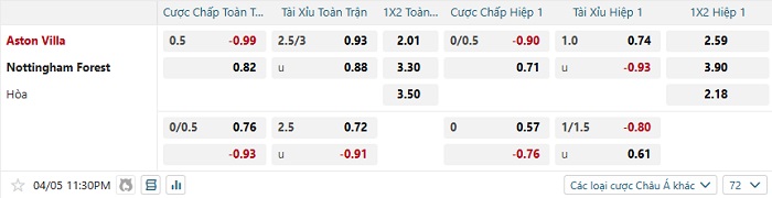 Tip kèo Châu Á full trận Aston Villa vs Nottingham