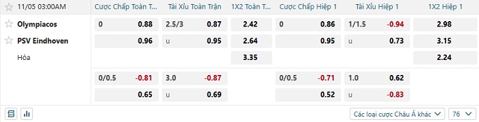 Tip kèo Châu Á hiệp 1 Olympiacos vs PSV
