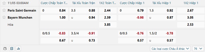 Tip kèo Châu Á hiệp 1 PSG vs Bayern Munich