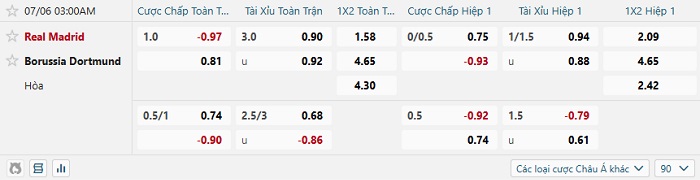 Tip kèo Châu Á hiệp 1 Real Madrid vs Dortmund