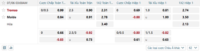 Tip kèo Châu Á full trận Tromso vs Molde