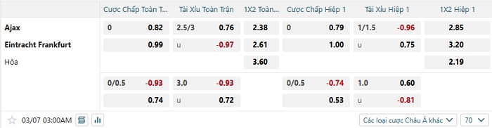 Tip kèo Châu Á full trận Ajax vs Frankfurt