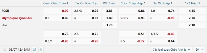 Tip kèo Châu Á full trận FCSB vs Lyon