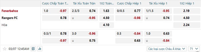 Tip kèo Châu Á hiệp 1 Fenerbahce vs Rangers