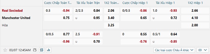 Tip kèo Châu Á full trận Real Sociedad vs Man United
