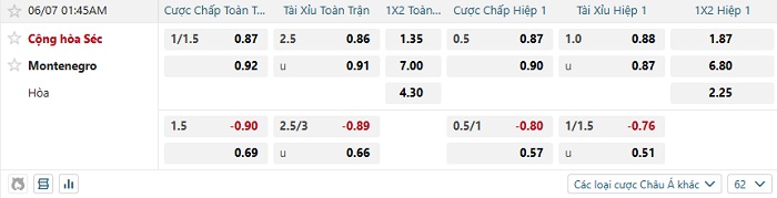 Tip kèo Châu Á hiệp 1 CH Séc vs Montenegro