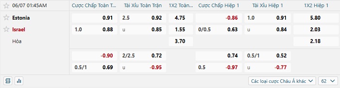 Tip kèo Châu Á full trận Estonia vs Israel