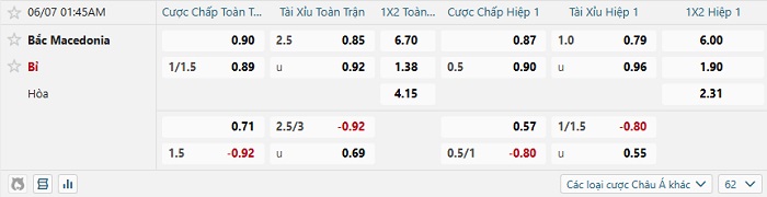 Tip kèo Châu Á hiệp 1 Bắc Macedonia vs Bỉ